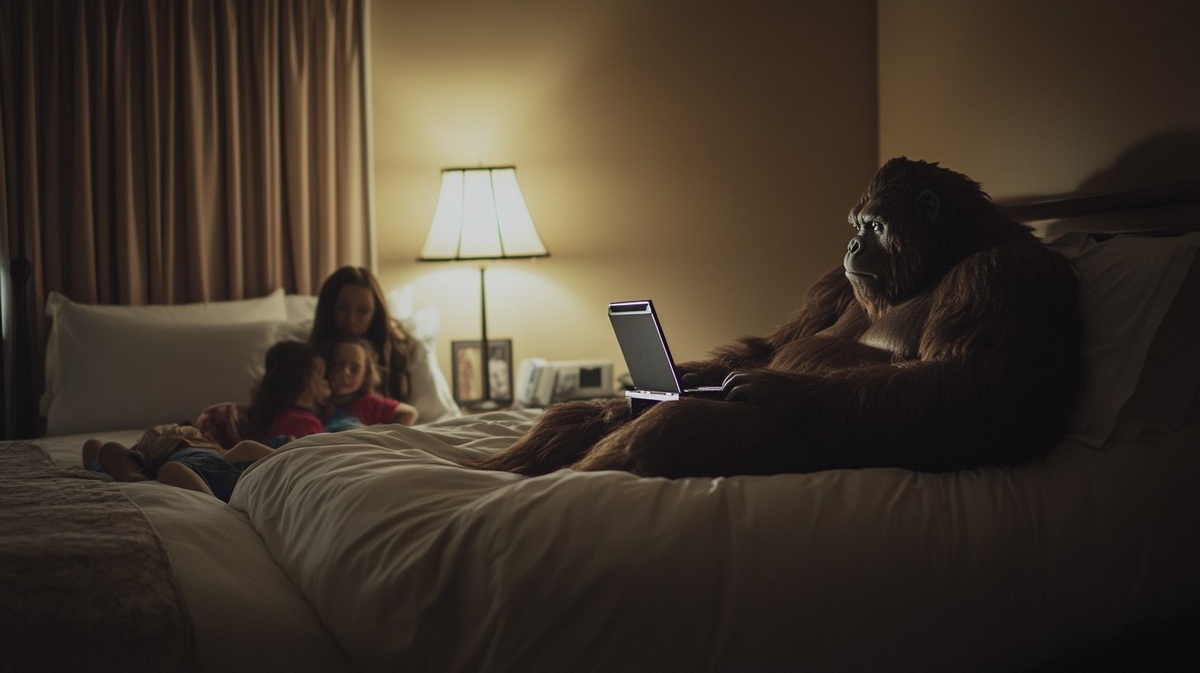 Создано на основе запроса: a human sized sasquatch laying in a small bed in a hotel room next to a king size bed that has a mother and her