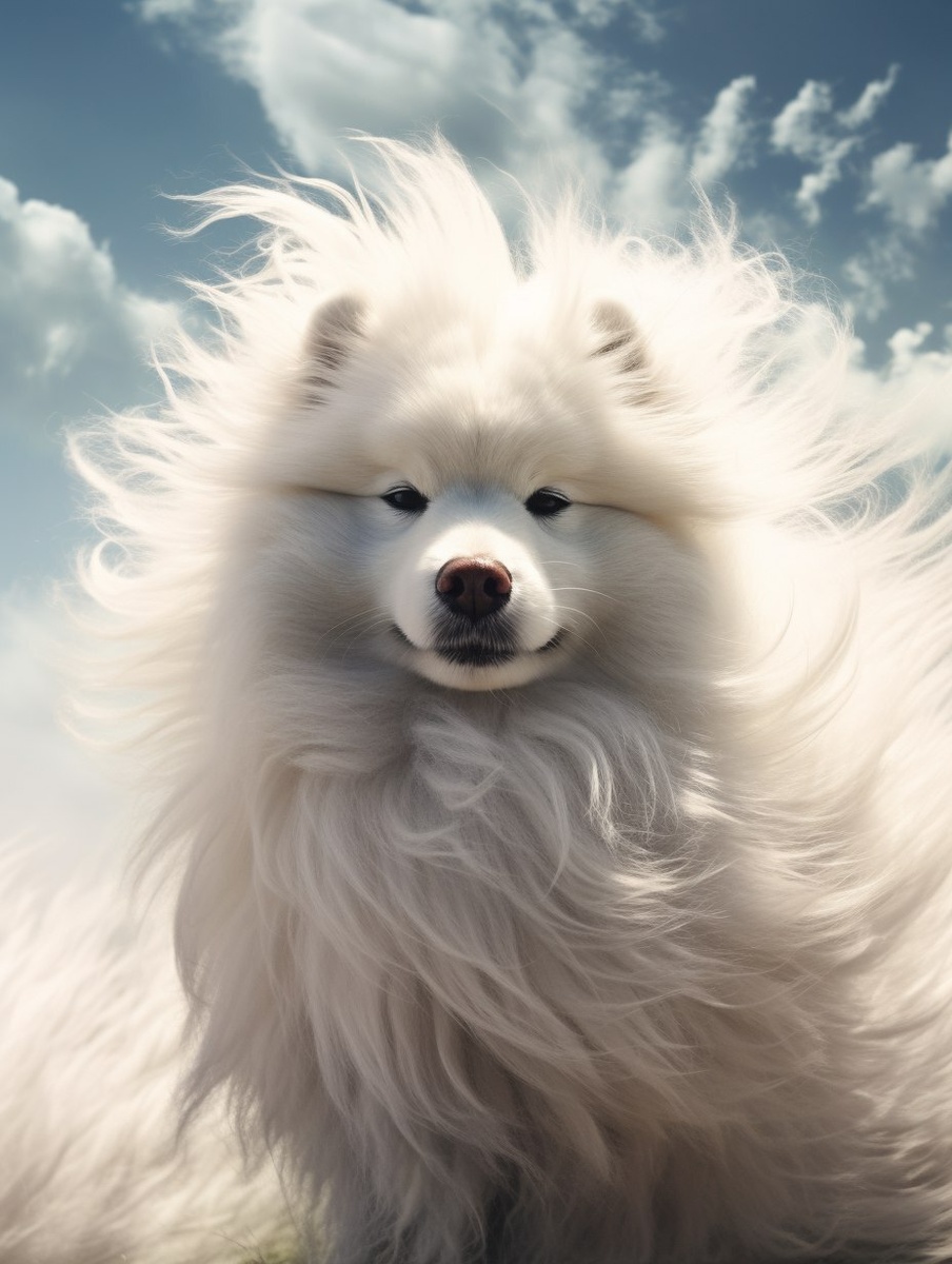 Создано на основе запроса: A fluffy Samoyed dog with its fur dramatically blown by the wind or a powerful hair dryer, fur floating and