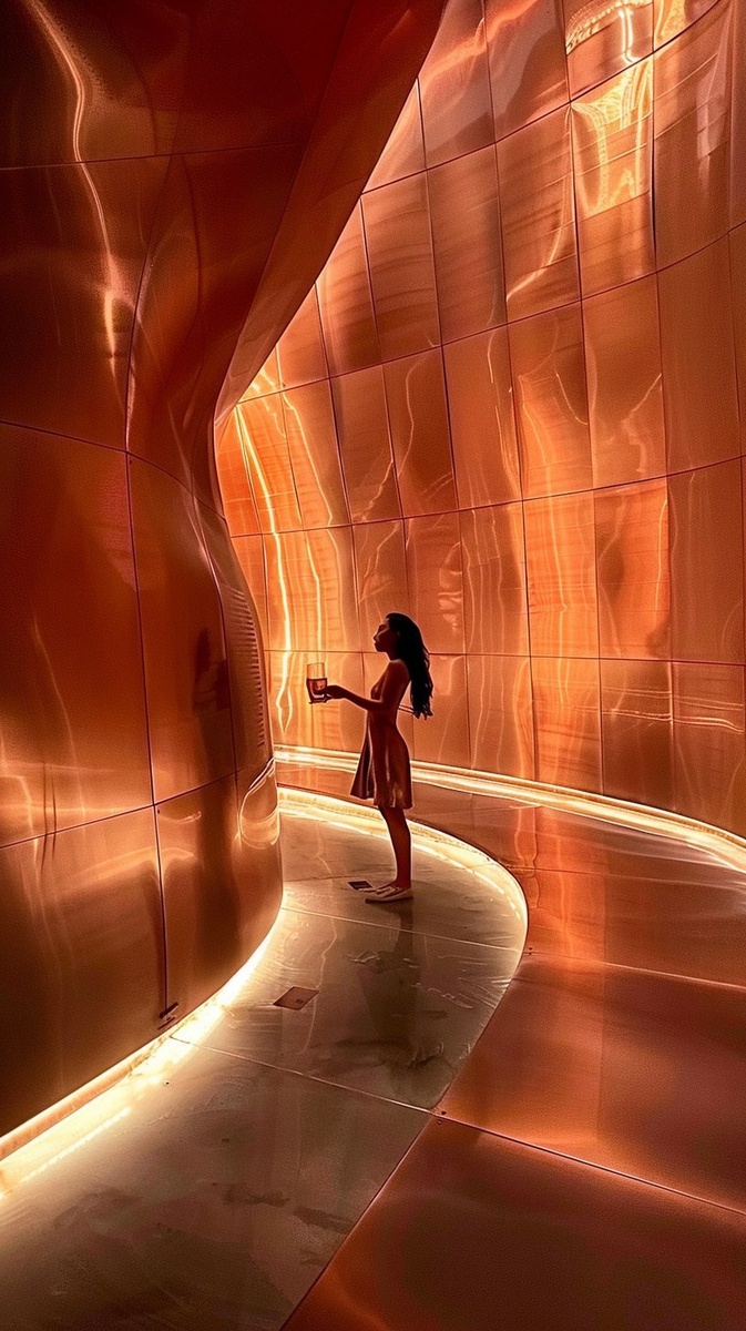Создано на основе запроса: a sculptural room made of copper, well lit but dramatic, a high net worth individual stands in it looking up