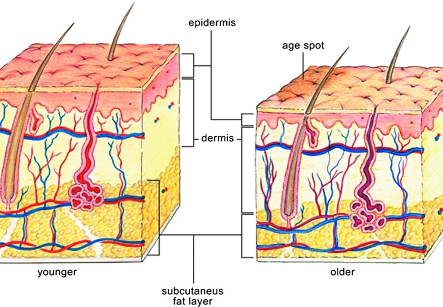 Наиболее последовательным структурным изменением в состарившейся коже является уплощение дермо-эпидермального соединения более, чем на треть. На рисунке хорошо видна разница между молодой кожей (слева) и возрастной (справа). Этот процесс происходит в результате потери кожных сосочков, а также в результате уменьшения взаимовлияния между слоями. Сглаживание, наблюдаемое с помощью сканирующей электронной микроскопии, начиная с шестого десятилетия жизни, приводит к меньшей устойчивости к силам сдвига и повышенной уязвимости к воздействию окружающей среды. Чем меньше взаимосвязь между двумя слоями, тем меньше запас питательных веществ и кислорода в клетках, и повышенный риск дермо-эпидермального разделения - процесса, который может быть механизмом образования морщин.