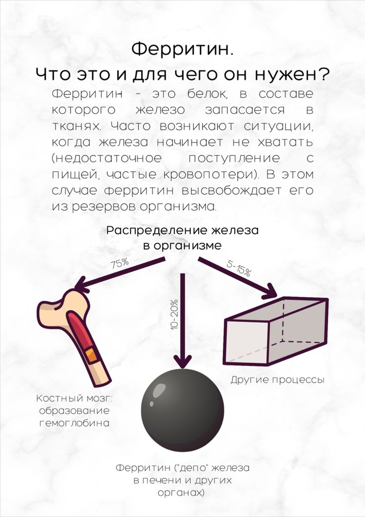 И его нужно проверять отдельно. Ферритин — это белок, который хранит железо в организме.