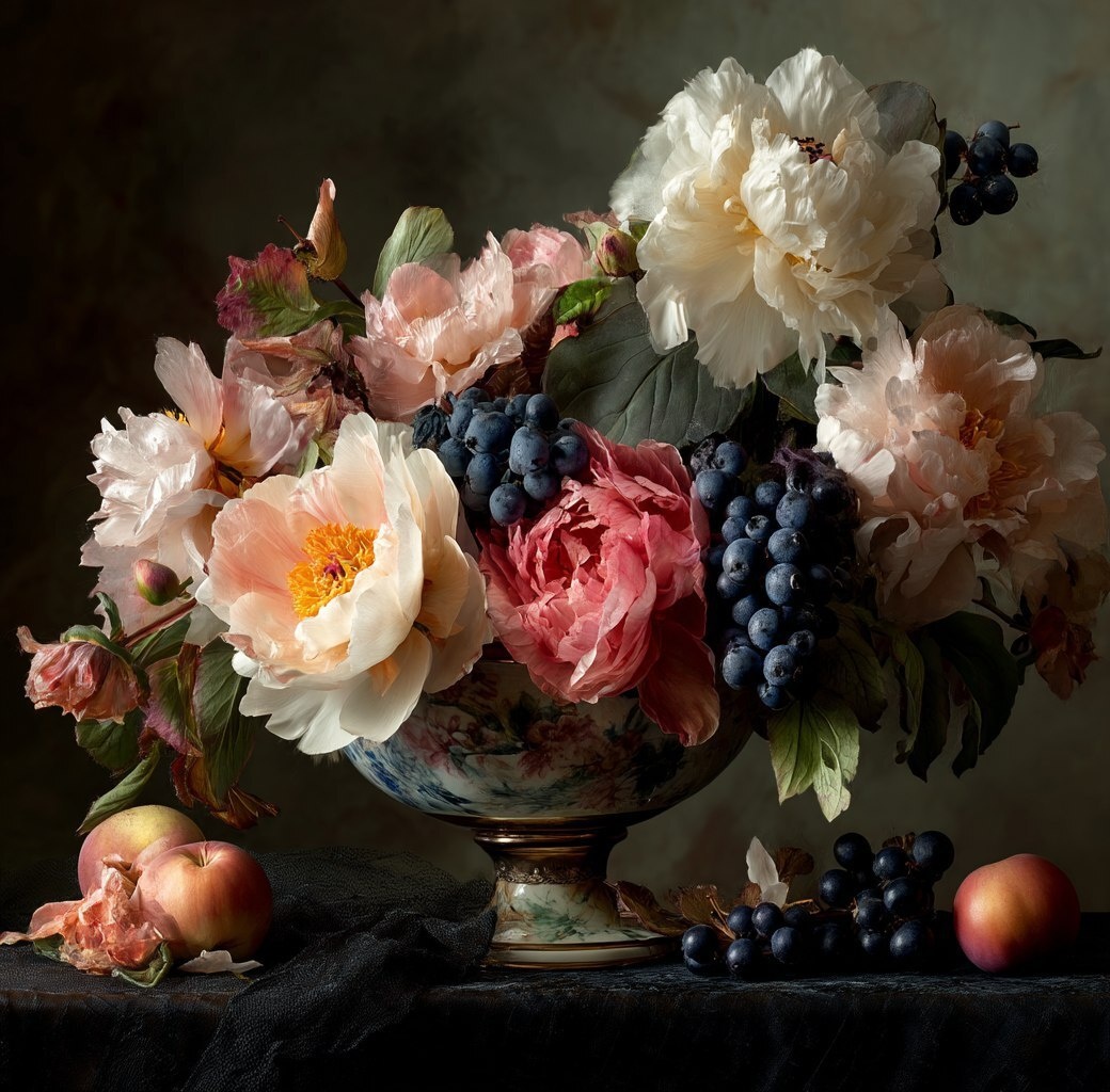 Создано на основе запроса: Still life with flowers and apples in an elegant bowl, blueberries and grapes, pink peonies, dark background, in
