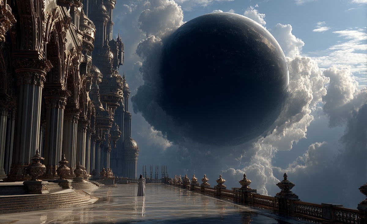 Создано на основе запроса: A large, dark planet hangs in the sky before an ornate palace