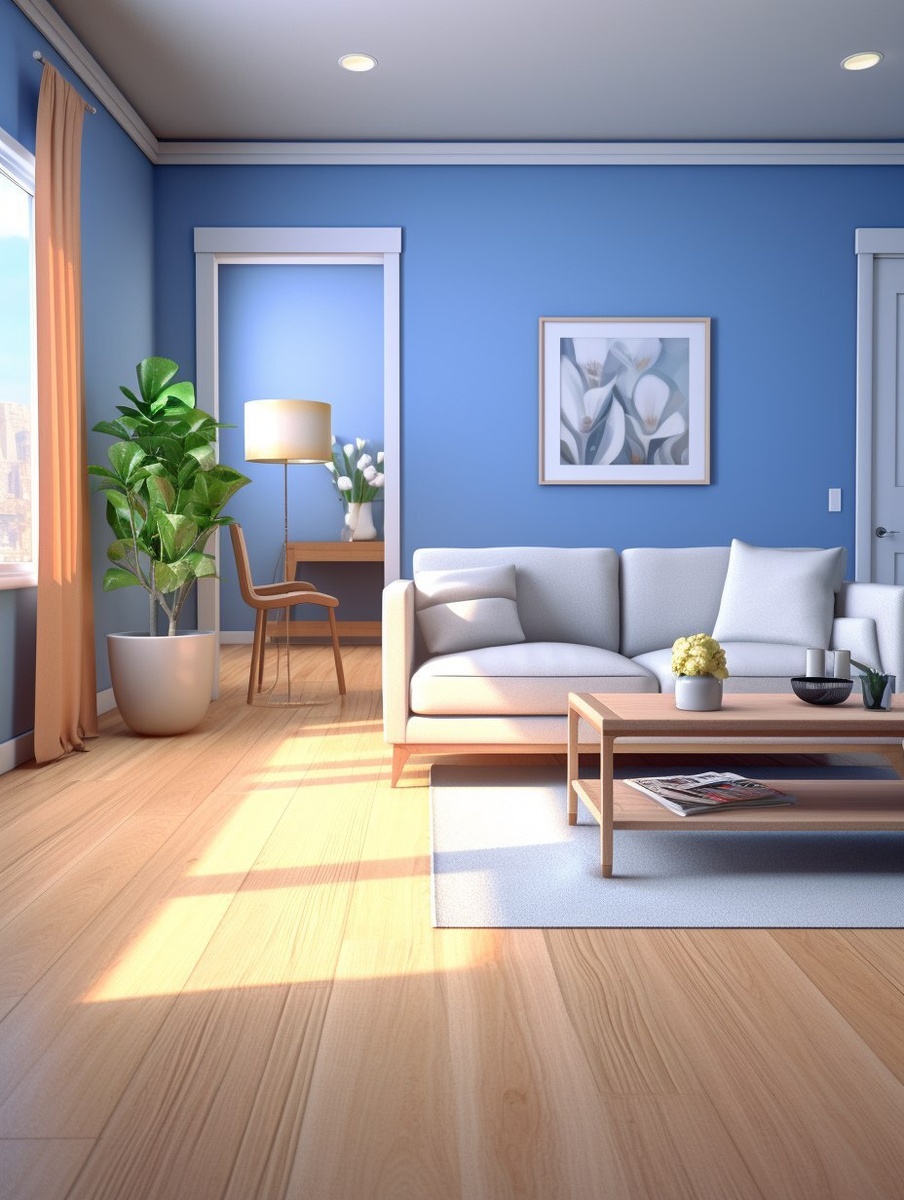 Создано на основе запроса: A realistic yet slightly AI-stylized interior of a modern room, with a light wooden floor and blue walls, a