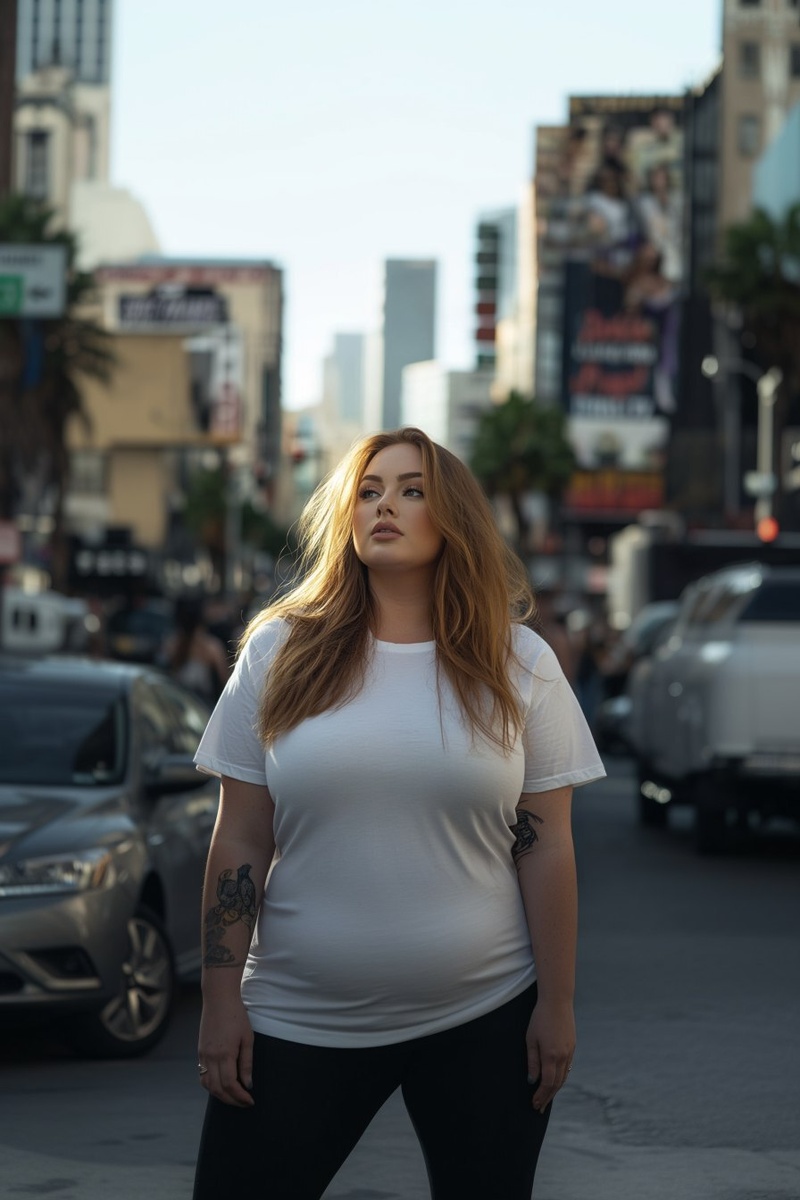 Создано на основе запроса: wide shot: plus-size pop singer adele in a white t shirt on the street in downtown los angeles mexican area