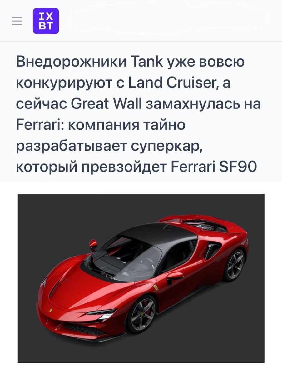 Присядьте: китайский Great Wall уже 5 лет ТАЙНО разрабатывает суперкар, который должен превзойти… Ferrari. В компании заявили, что они создают спорткар, который должен оказаться «не хуже» Ferrari SF90. Проект засекречен по максимуму, но известно, что он стартовал ещё в 2020 году. В планах — максимум эмоций, карбоновый кузов (если найдут, кто его вообще сделает в Китае) и зарплаты разработчикам до $710 тысяч в год.
