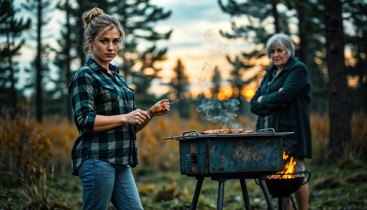Вечер опустился на лес мягким покрывалом. Небо стало тёмно-синим, усыпанным первыми звёздами, а костёр на поляне пылал ярко, отбрасывая танцующие тени на траву. Запах жареного мяса смешивался с дымом, дразня аппетит. Семья собралась вокруг мангала: Джеймс снимал шампуры с огня, дети сидели на старом одеяле, жуя мясо и пачкая пальцы жиром, Маргарет руководила всем процессом, то и дело поправляя дрова или переворачивая мясо. Но между Элизой и свекровью воздух был густым от напряжения, как перед грозой.