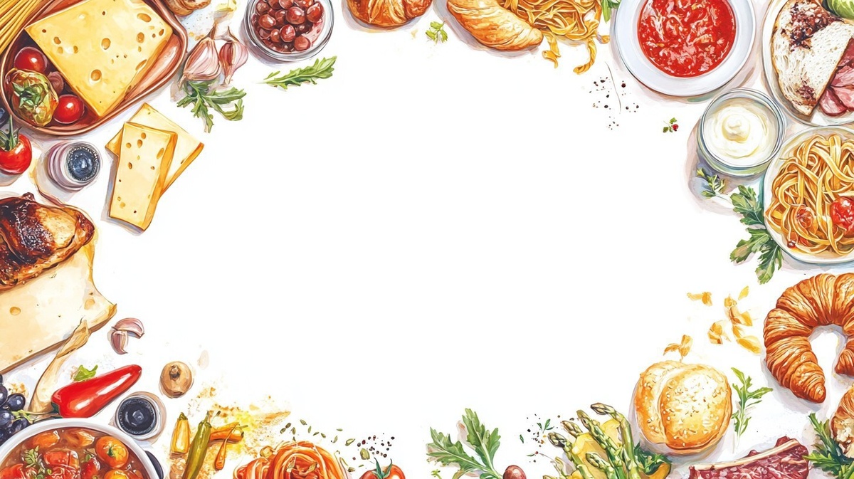 Создано на основе запроса: white background with border of food items, bowl of soup with vegetables scattered around, fruit smoothie with fruit scattered around, pasta dish with garlic chilli and herbs scattered around and bread, cheese, chicken, steak, doughnut, croissant throughout, white space in middle, realistic, --- Автоперевод: Белый фон с границей с пищевыми продуктами, миска с супом с овощами, разбросанными вокруг, фруктовые смузи с фруктами, разбросанными вокруг, блюдо из пасты с чесночным чили и травами, разбросанными вокруг, и хлеб, сыр, курица, стейк, пончик, круасса по всему, белое пространство посередине, реалистично, реалистично, Как тебе вариант? 🤔 https://dzen.ru/id/65c0c65c86e4f837c27b24d7 #ИИ #AI #нейросеть #midjourney #art