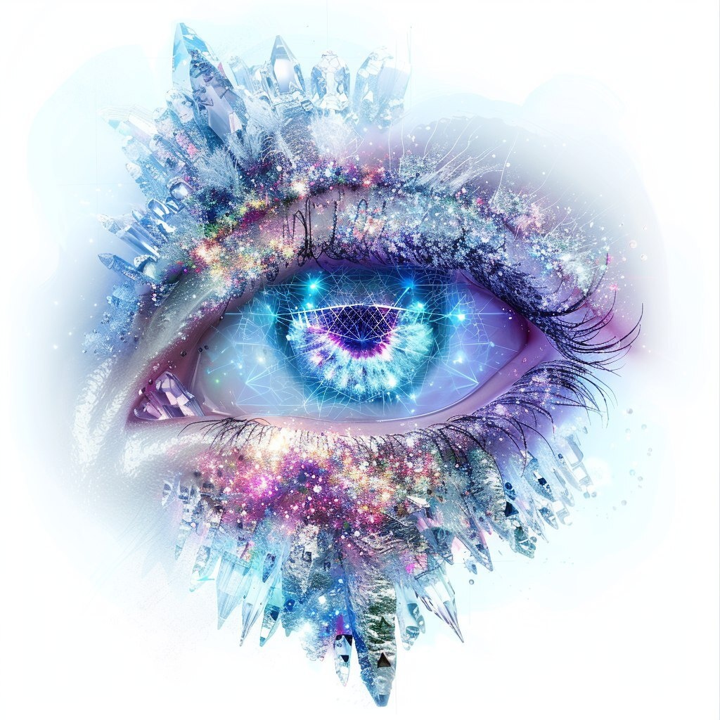 Создано на основе запроса: A mystical floating eye made of crystal shards and glittering particles, surrounded by sacred geometry halos