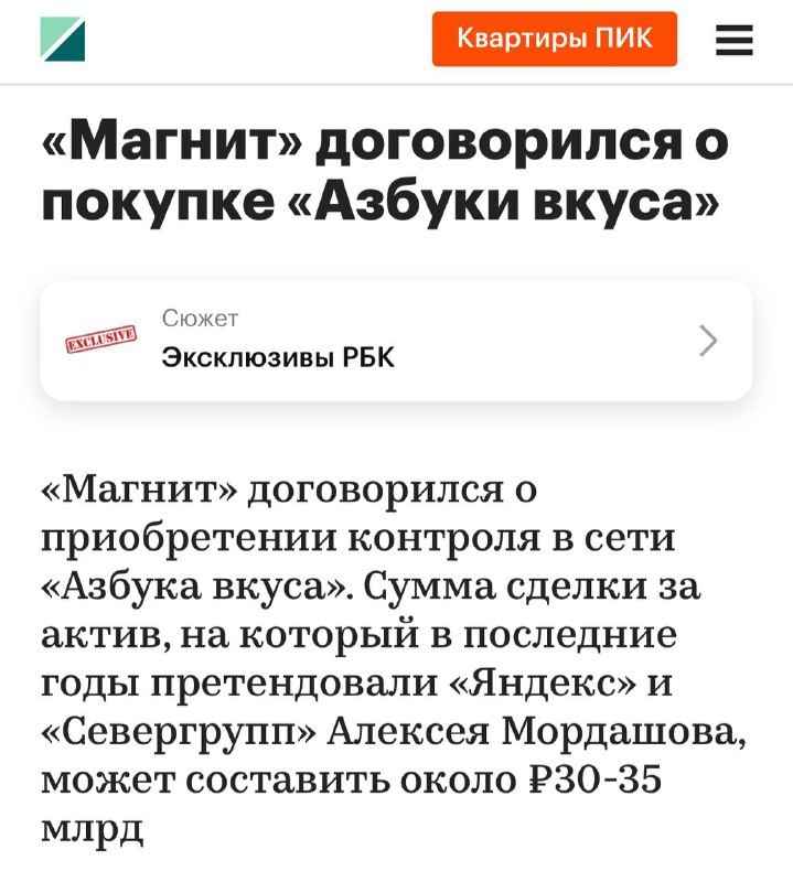 Официального анонса пока нет, но три источника уже подтвердили инфу. Оценка сделки — 40 млрд ₽.