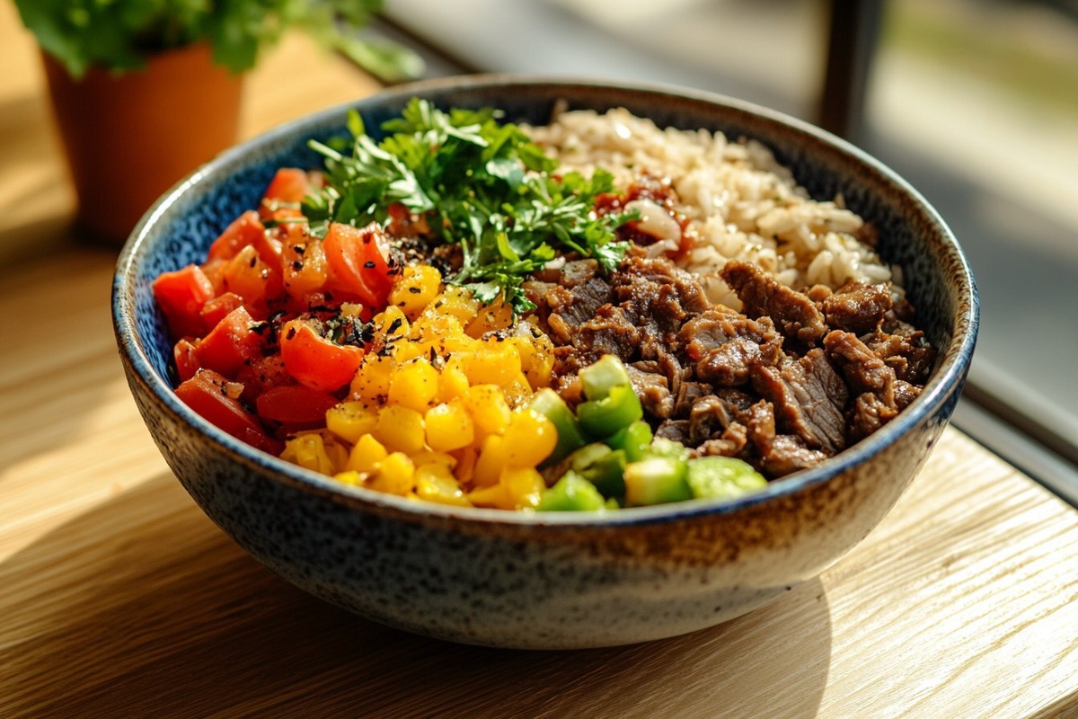 Создано на основе запроса: Title: Beef and Pepper Rice Bowl | STYLE: Close-up Shot right view | EMOTION: realistic as possible | SCENE