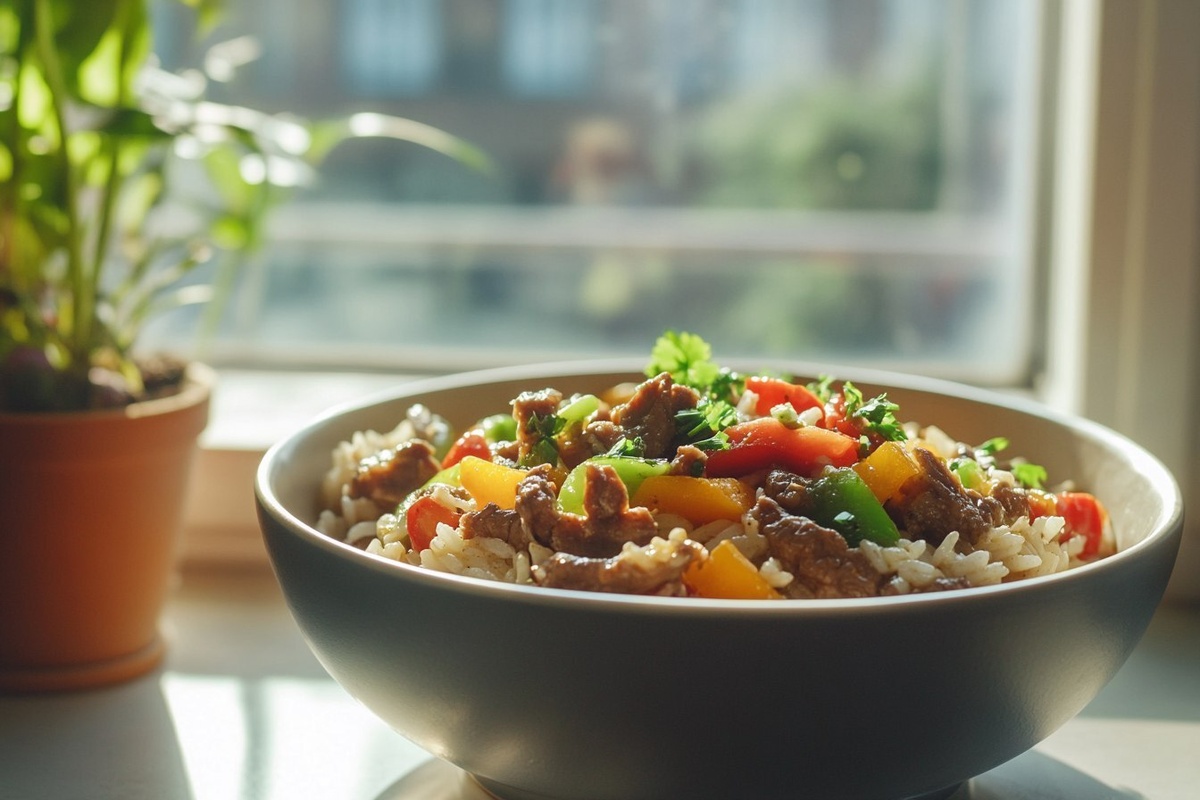 Создано на основе запроса: Title: Beef and Pepper Rice Bowl | STYLE: Close-up Shot right view | EMOTION: realistic as possible | SCENE