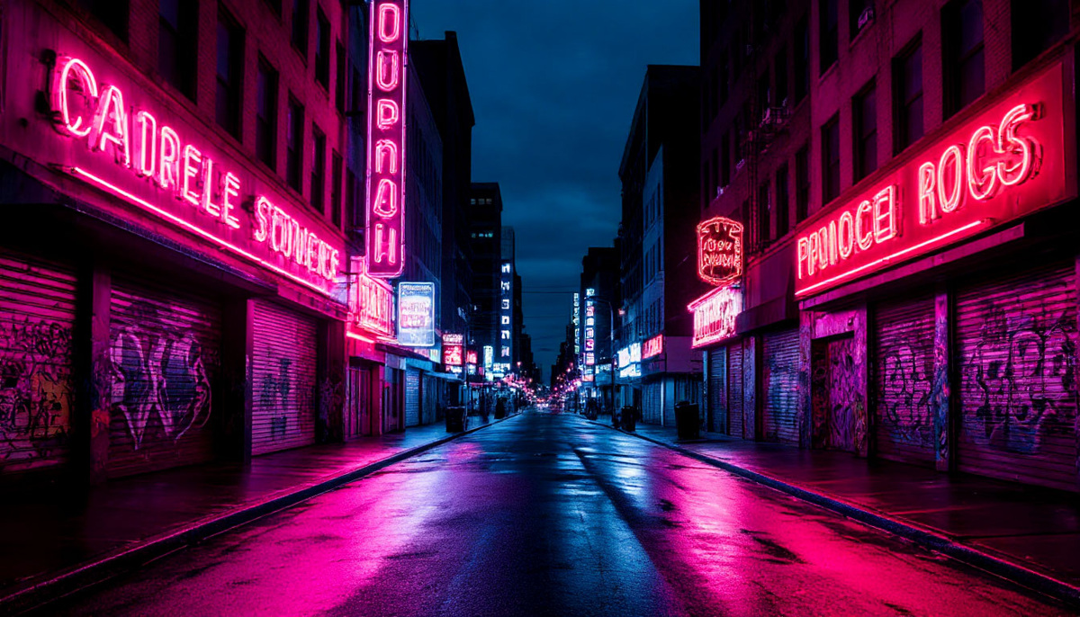 Некогда оживленная улица теперь была тиха; единственным звуком был редкий шелест газеты, танцующей на ветру. Город вокруг неё представлял собой полотно из закрытых витрин и выцветшей краски, испещрённое граффити — мрачное напоминание о лучших временах.