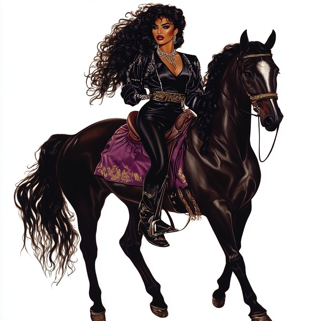 Создано на основе запроса: Selena quintanilla riding horse, white back ground