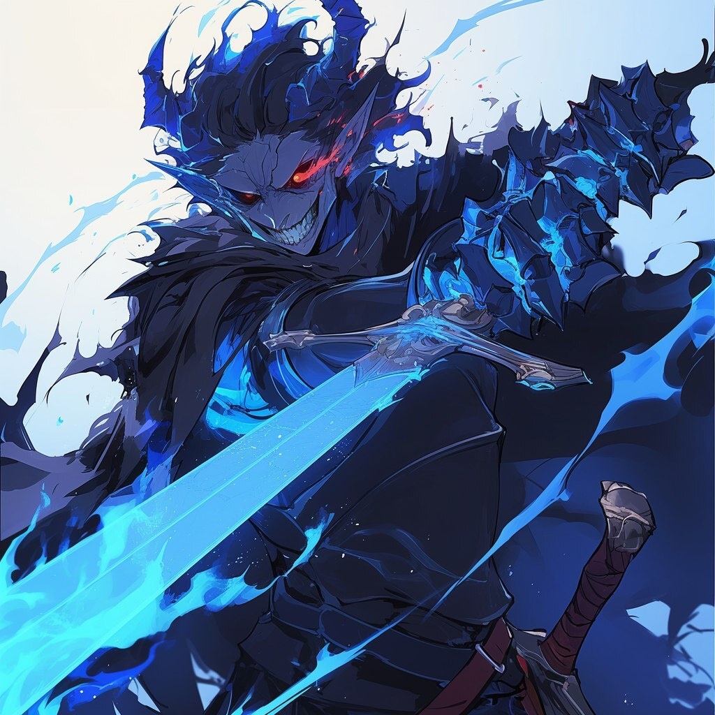 Создано на основе запроса: male demon, sharp teeth, glowing red eyes, evil grin on face, wearing a tattered black cloak, wielding a shiny
