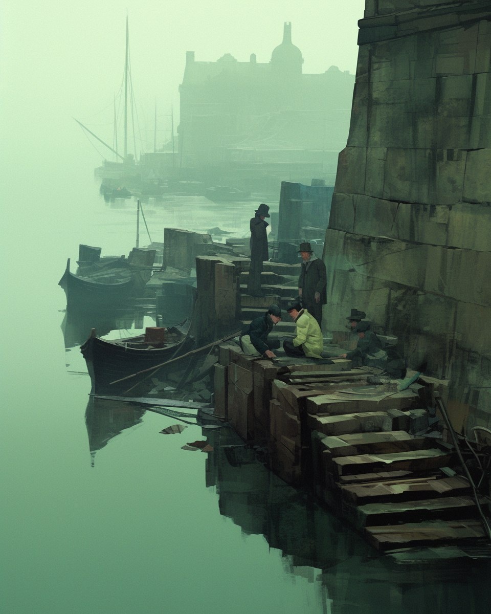 Создано на основе запроса: 1850 scene of a 19th century fworkers at a stone embankment, near an old industrial buildings on a river, in the style of victorian glasgow. in the style of coastal and harbor views, mountainous vista. in the style of realistic anamorphic art. Low fog and thick dust in the air. Luminous brushwork. storybook style, dusty piles. concept art, sergey kolesov style, sorolla style, expresive style. Pale, cold color palette --- Автоперевод: 1850 Сцена сцена 19 -го века на каменной набережной, недалеко от старых промышленных зданий на реке, в стиле викторианского Глазго. Красиво выглядит? 🤔 https://dzen.ru/id/65c0c65c86e4f837c27b24d7 #ИИ #AI #нейросеть #midjourney #art