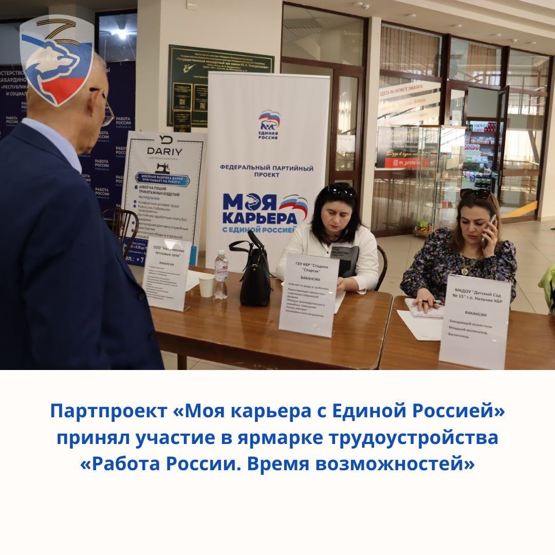 Партпроект «Моя карьера с Единой Россией» принял участие в ярмарке вакансий, которая прошла сегодня в Государственном концертном зале КБР в Нальчике Стенд проекта партии «Единая Россия» работал на протяжении всего мероприятия, сообщает KABARDIN-BALKAR.ER.RU. Директор ГКУ "Республиканский центр труда, занятости и социальной защиты населения", член комитета парламента КБР по труду, социальной политике и здравоохранению, член РПС партии «Единая Россия» Татьяна Канунникова, открывая мероприятие, отметила, что ярмарка вакансий – это важная площадка для встречи работодателей и работников. «Сегодня в Кабардино-Балкарии проходит республиканский этап Всероссийской ярмарки трудоустройства «Работа России. Время возможностей». По республике в рамках мероприятия предоставлены 2200 вакансий. Из них, здесь , на нашей площадке представлены 1700 вакансий от 40 работодателей», - сказала Канунникова. Главный федеральный инспектор по КБР Дмитрий Васильченко отметил, что вопросы трудоустройства входят в