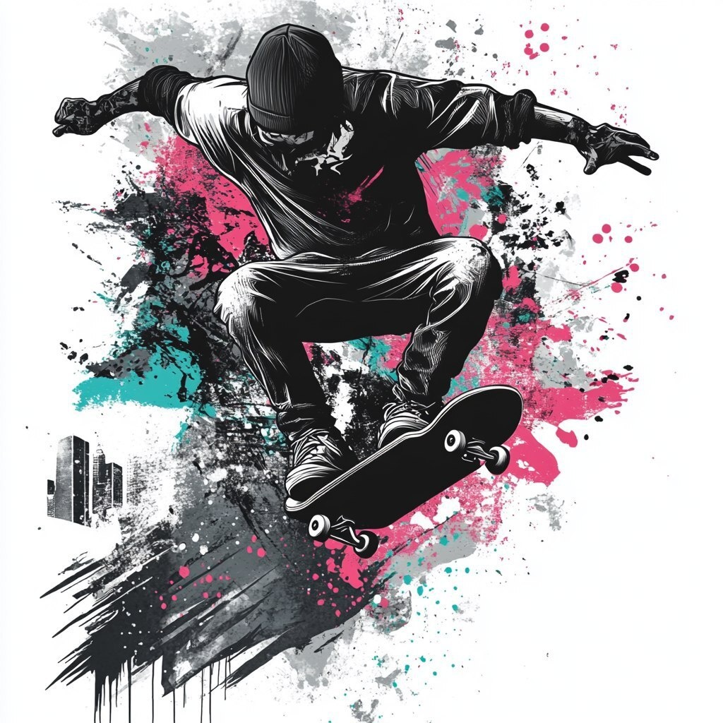 Создано на основе запроса: Create a bold, edgy skateboarding T-shirt design. Focus on a rebellious streetwear vibe. Feature a dynamic illustration of a skateboarder mid-trick (like a kickflip or grind) with graffiti elements in the background. Use urban textures like cracked concrete, spray paint splashes, and bold, rough typography. The colors should be high-contrast - black, white, and pops of neon (green, pink, or blue). Include street icons like skulls, flames, or city skylines subtly worked into the design. Overall, it should feel fast, chaotic, and cool - perfect for skaters. --- Автоперевод: Создайте смелый, острый дизайн футболки. Как тебе изображение? 🤔 https://dzen.ru/id/65c0c65c86e4f837c27b24d7 #ИИ #AI #нейросеть #midjourney #art