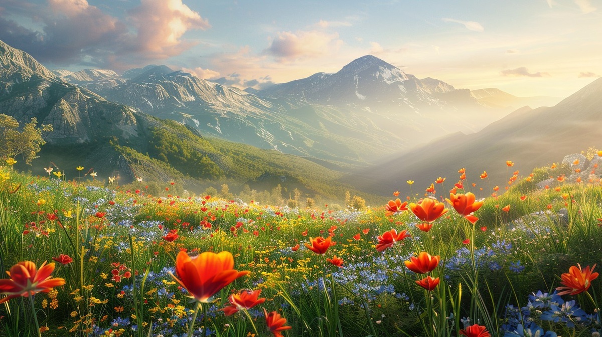 Создано на основе запроса: a colorful spring valley filled with wildflowers during a soft morning light, fresh vibrant atmosphere, cinematic