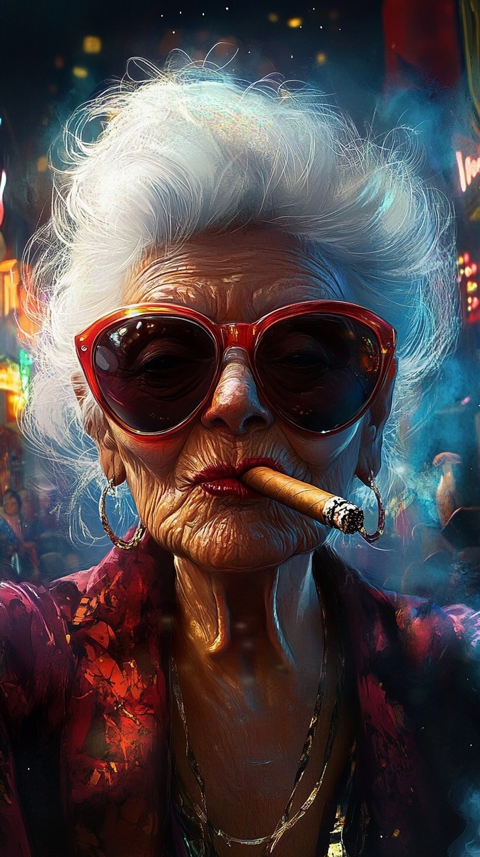 Создано на основе запроса: old lady, at a party, sunglasses on, cigar in her mouth, a bad girl image
