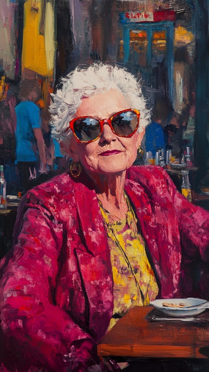 Создано на основе запроса: half body portrait of an old lady from the waist up, at a party, sunglasses on, a bad girl image