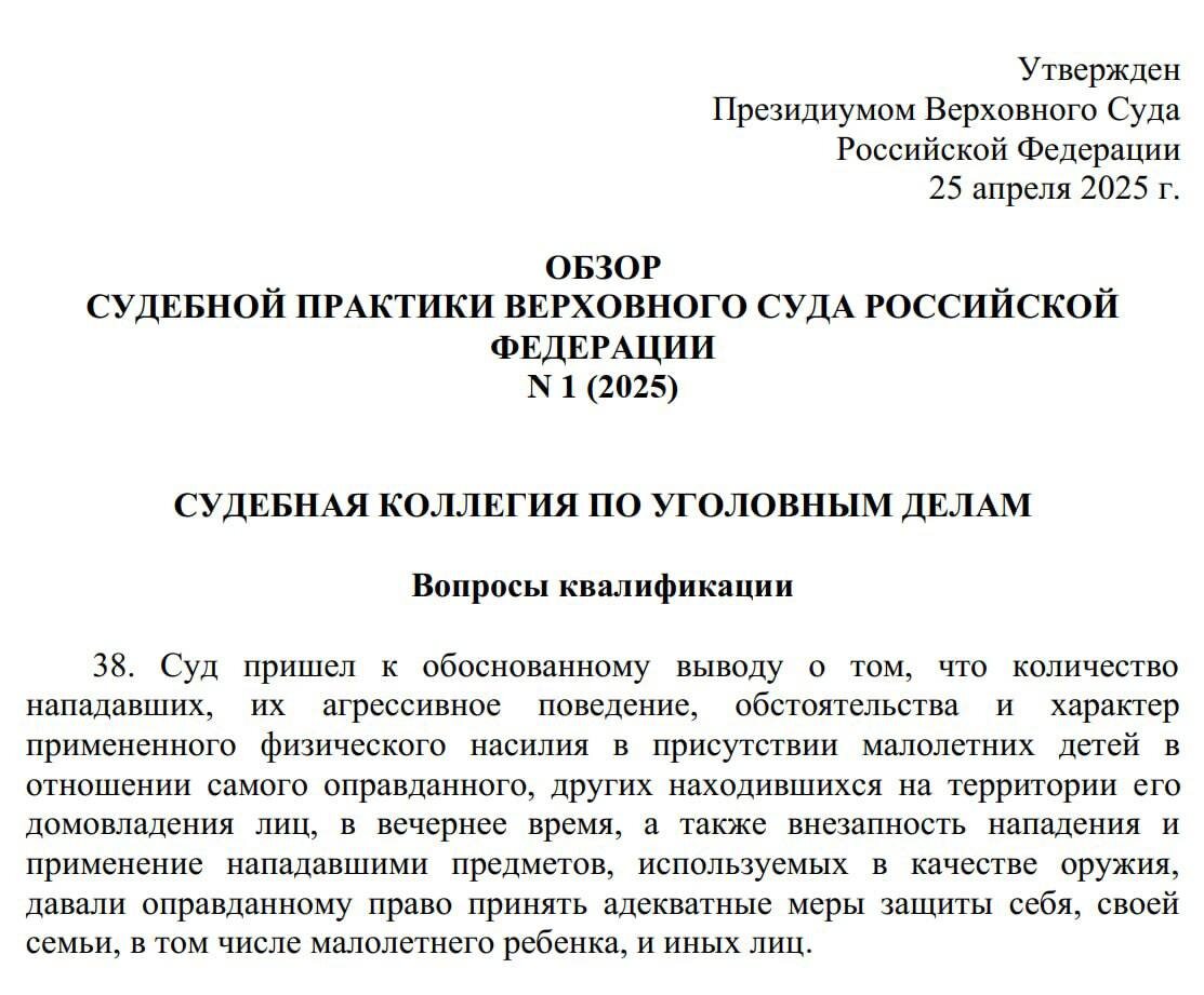 Тут намедни вышел новый Обзор практики Верховного Суда за 1 квартал Начинаешь читать и холодеешь - в начале сплошь убийства по 2-105-й. Много интересного про необходимую оборону - наконец-то разрешено убивать напавших на твой дом/участок😎😱. Однако, прибыв к домовладению З., вооружившись деревянным черенком и деревянной палкой, П., О.М., Т. ворвались на придомовую территорию, где, действуя быстро и согласованно, нанесли удары З., на руках у которого была малолетняя дочь, и избили В. палкой, черенком от лопаты и ногами. Сумевший убежать З. взял со стола нож. Увидев, что продолжается избиение В., который не подавал признаков жизни и которого пытаются безуспешно защитить П.Е. и С. с его малолетним ребенком на руках, З. осознавая численное превосходство нападавших, подбежал и, защищая жизнь и здоровье своих родных, в том числе ребенка, и друзей, нанес удары ножом О.М., П. и Т. Постановлен оправдательный приговор, и при установленных обстоятельствах, пожалуй, это правильно. Беда только в