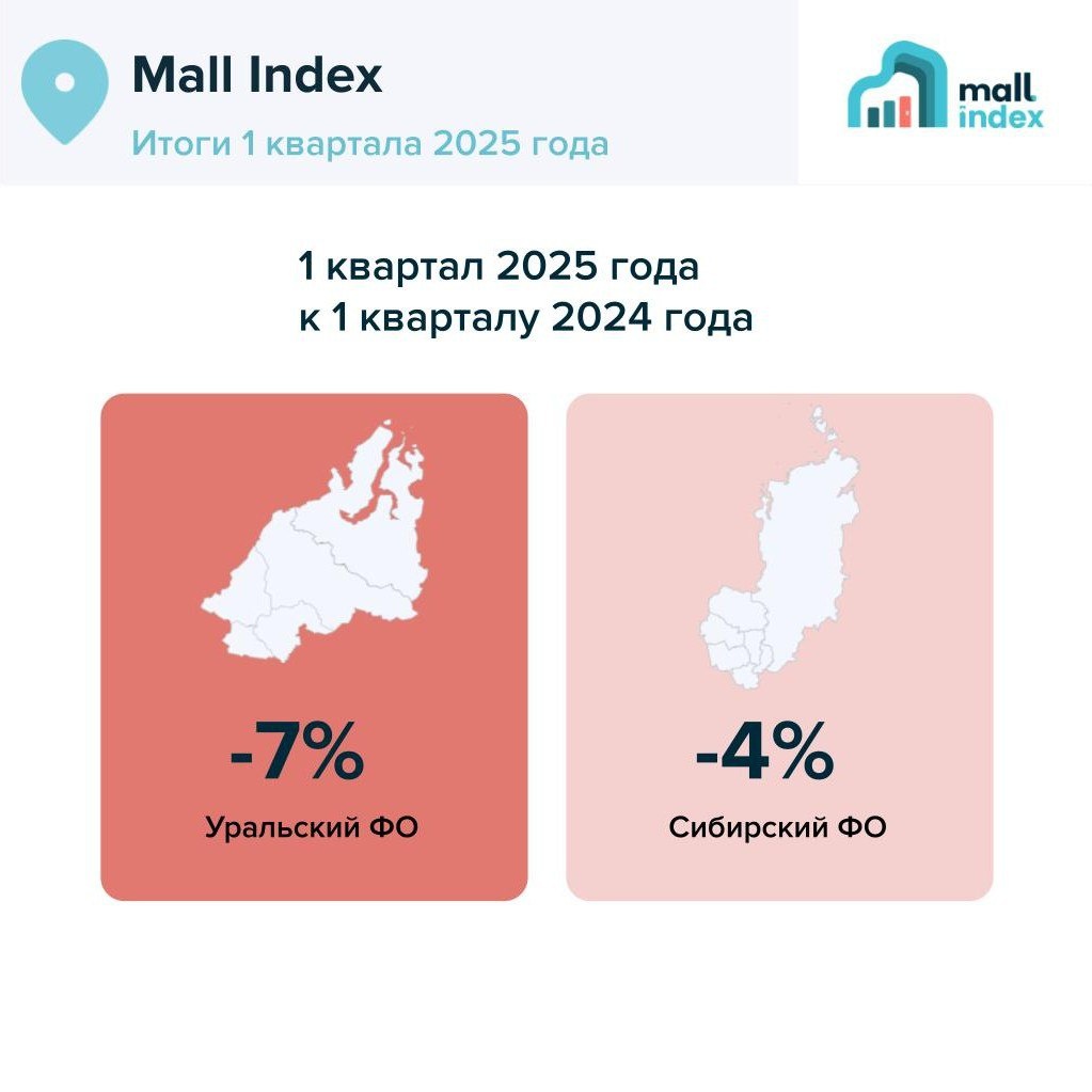 📊Mall Index: итоги 1 квартала 2025 📍 Уральский и Сибирский ФО 1 квартал 2025 vs 1 квартал 2024 • УФО: -7% • СФО: -4% Что интересно, в сравнении с 1 кварталом 2023 года у обоих регионов сопоставимые значения: -7% Таким образом, на различия в динамике к прошлому году в значительной степени повлияли: 📌локальные факторы, действовавшие в первом квартале 2024 года; 📌остаточный эффект волны отложенного спроса, пик которого пришелся на вторую половину 2023 года. #MallIndex #анализрынка #тренды #ритейл #УФО #СФО