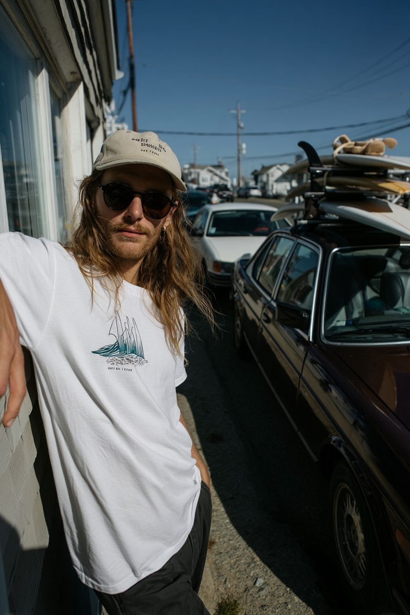 Создано на основе запроса: A white T-shirt with an embroidered logo on the chest, featuring surfboards and waves, worn by a surfer boy in sunglasses leaning against his brown car near a beach house. He is wearing a beige baseball cap, and has long hair, holding a surfboard under the armrest of an old, vintage Ford Mustang from the early 1980s. The shot is for a brand lookbook, with a clear blue sky, a bright, sunny day, natural lighting, and ultra-realistic photography. --- Автоперевод: Белая футболка с вышитым логотипом на груди с досками для серфинга и волн, которую носят серфер-мальчик в солнцезащитных очках, прислоненных к его коричневой машине возле пляжного домика. Как тебе изображение? 🤔 https://dzen.ru/id/65c0c65c86e4f837c27b24d7 #ИИ #AI #нейросеть #midjourney #art
