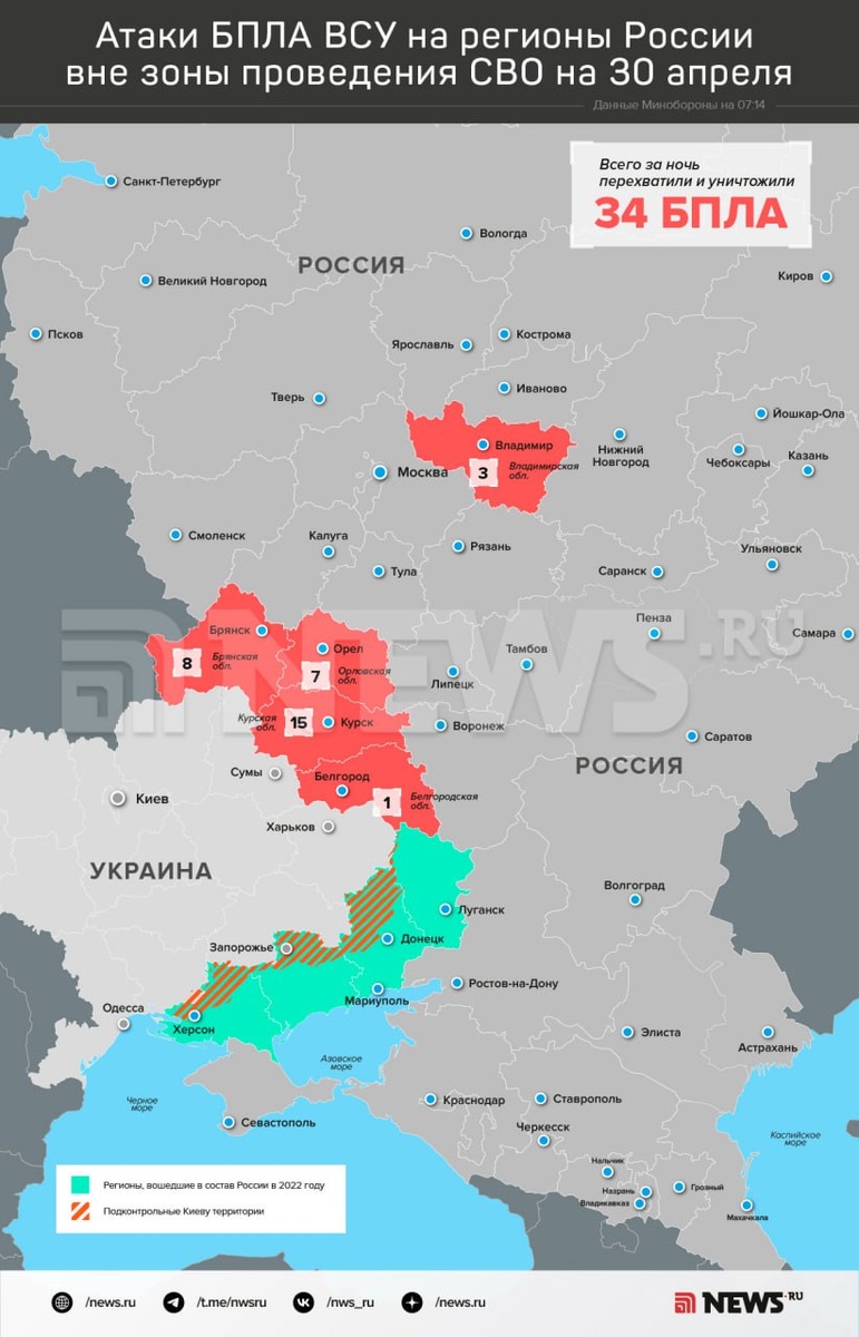ПВО за ночь сбила 34 украинских беспилотника над регионами России, передает Минобороны. 15 БПЛА сбиты над Курской областью, восемь — над Брянской, семь — над Орловской, три — над Владимирской и один — над Белгородской. Подписаться | Прислать новость | Буст