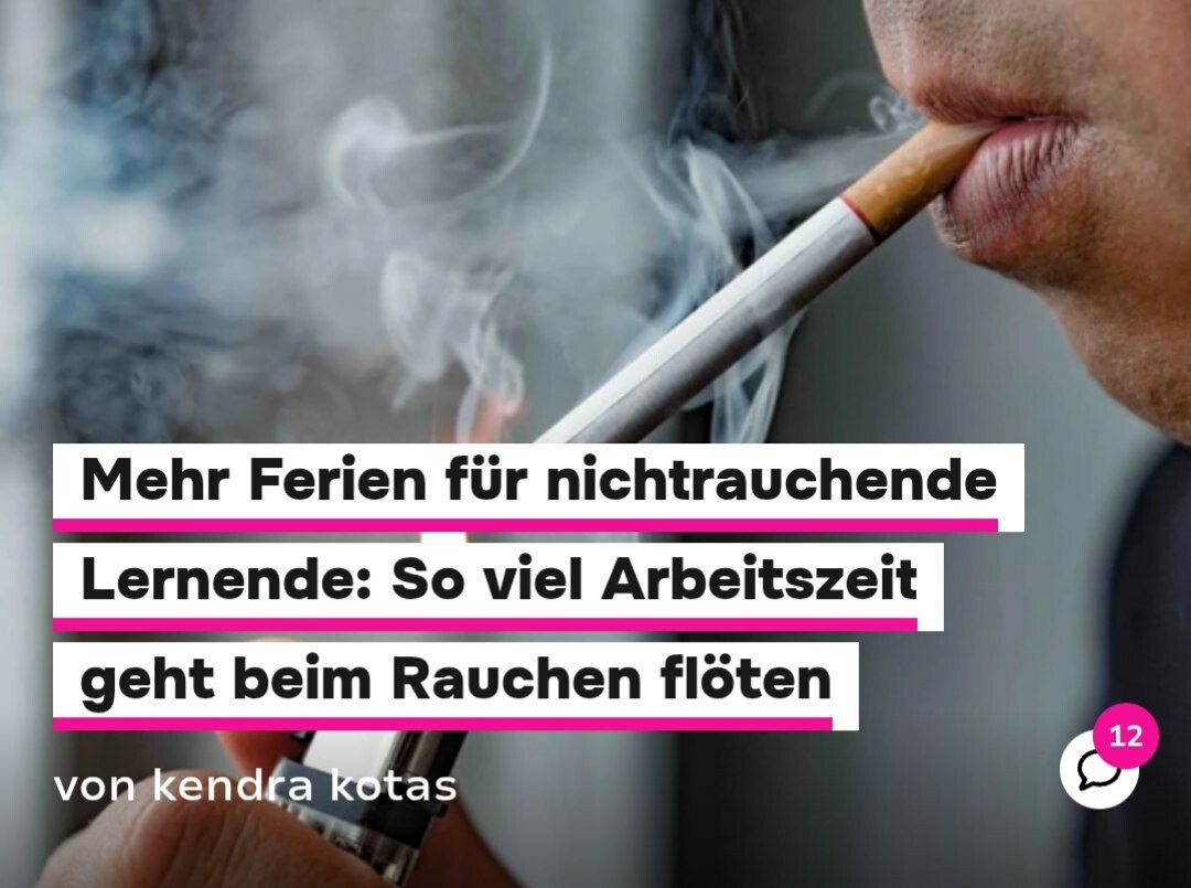 📌 " Известно, что курение вредно для здоровья. Тем не менее, четверть населения Швейцарии по-прежнему курит. Однако с 1992 года этот показатель снизился на 30 процентов. Эти цифры не учитывают потребление электронных сигарет, которое растет, особенно среди молодежи. В 2022 году 17 процентов молодых людей в возрасте от 15 до 24 лет употребляли табачные нагреватели, электронные сигареты, кальян или нюхательный табак. Теперь компании хотят предложить своим студентам стимулы для отказа от курения. К ним относятся дополнительные отпуска, ваучеры или бонусы. Идея поощрения некурящих не совсем нова и обсуждалась еще 25 лет назад. Однако в последние годы эта тема становится все более популярной среди швейцарских компаний. В компании Energie Thun в разделе отпусков указано "1 дополнительная неделя отпуска для неикурящих учеников". В течение примерно 20 лет до 2024 года швейцарская почта предлагала бонус в размере 300 швейцарских франков для учеников, которые воздерживались от курения в