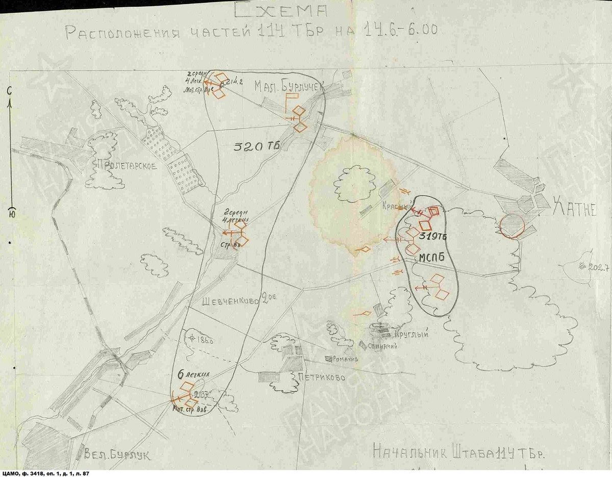 Согласно же разведсводке штаба 114-й ТБр, из Приколотного на совхоз Федоровка 15 июня атаковало до 30 танков, а из Приколотного на совхоз Пионер – еще до 50 танков. В Малый Бурлучек немецкие танки прорвались еще до 12.30, после чего 30 немецких танков в 12.30 двинулись из Малого Бурлучка по лощине дальше на Зарубинку. Следом за танками из Приколотного в Малый Бурлучек вошло до 40 автомашин с пехотой и 6 орудиями ПТО, большая часть пехоты спешилась и с 16.00 начала окапываться на восточной окраине этого села, а 8 автомашин с пехотой и 2 орудиями ПТО из Малого Бурлучка двинулись вдоль Большого Бурлука на Шевченково 2-е. Ранее оборонявшийся в Малом Бурлучке, 48-й стрелковый полк 38-й стрелковой дивизии оставил свои позиции и отошел вместе с танками 114-й ТБр за балку Красный Яр, заняв оборону на высотах 209,0 и 205,0 к северо-западу и юго-западу от села Хатне.