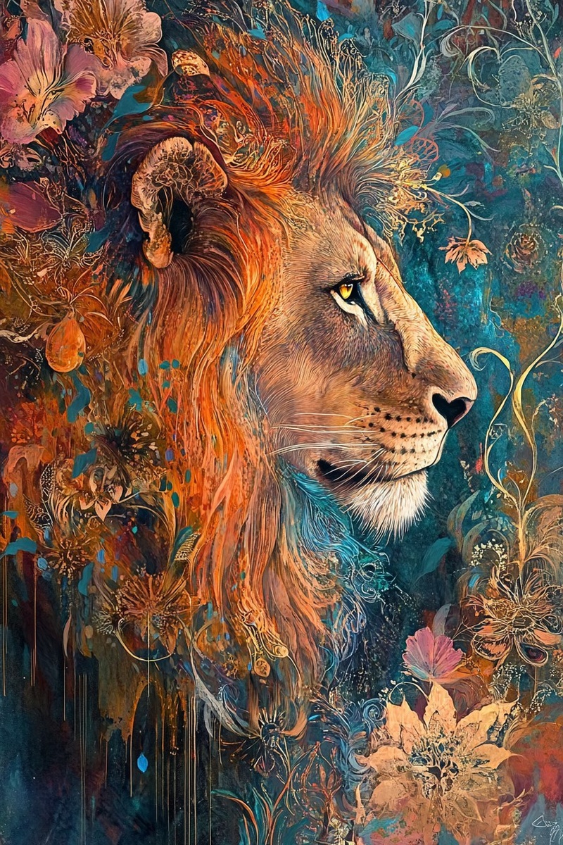 Создано на основе запроса: lion profile, vivid colors, soft light, Neo-romanticism, Glamour fashion, ebru, aerosol paint, Filigree