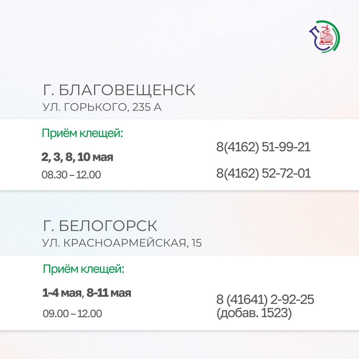 График работы лабораторий Центра гигиены и эпидемиологии по приёму клещей на исследования в выходные и праздничные дни 📍г.Благовещенск, ул. Горького, 235а 2, 3, 8 и 10 мая с 09:00 до 12:00 ☎️8(4162) 51-99-21, 8(4162) 52-72-01 📍г.Белогорск, ул. Красноармейская, 15 1-4 мая, 8-11 мая с 09:00 до 12:00 ☎️8 (41641) 2-92-25 (добав. 1523) 📍г.Зея, ул. Народная, 11 2 и 4 мая с 09:00 до 12:00 ☎️8 (41658) 2-48-51, 8 (41658) 2-40-39 📍г.Свободный, ул. Шатковская, 116 2, 3, 8 и 10 мая с 09:00 до 12:00 ☎️8 (41643) 3-52-30 (добав. 1534), 8 (41643) 3-53-64 5, 6, 7 мая лаборатории будут работать в обычном режиме Уважаемые амурчане, при посещении природных зон помните о мерах профилактики клещевых инфекций! 🔬 @cge_amur