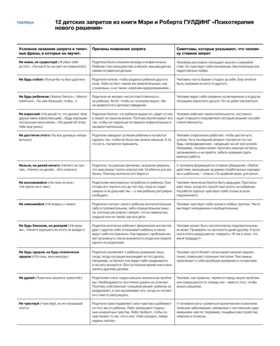 В тему фраз обращения к детям. Слова имеют значение и смысл, особенно когда их произносит тот, для кого мама- это весь мир . По этой таблице я и у себя нашла несколько запретов. Я не была идеальной мамой, и у моих детей они есть. Что делать с запретом? Осознать их- уже 50% работы. Менять осознанно. Можно идти с ними в работу. В системной терапии есть волшебные фразы исцеления. Пишите в комментариях, что кому отозвалось, помогу разобраться.❤