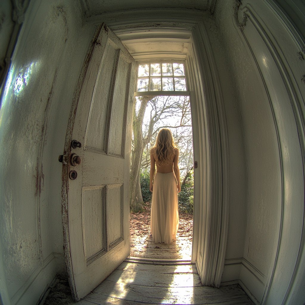 Создано на основе запроса: looking at a strangely beautiful woman through the door viewer a fisheye lens