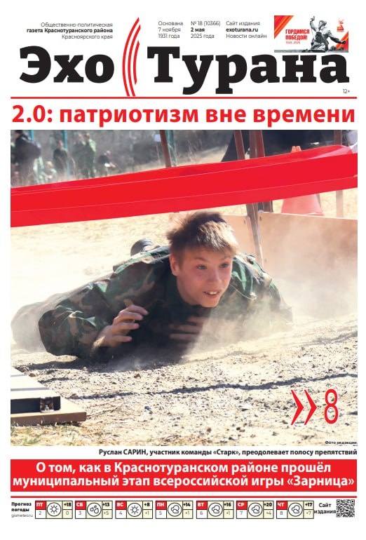 ВНИМАНИЕ! В связи с грядущими праздничными выходными уже завтра в продаже новый выпуск газеты «Эхо Турана». Читайте в свежем номере: ПАТРИОТИЗМ ВНЕ ВРЕМЕНИ – о том, как в Краснотуранском районе прошёл муниципальный этап Всероссийской военно-патриотической игры «Зарница 2.0» БЕСЦЕННЫЕ УРОКИ СТАРШЕГО ПОКОЛЕНИЯ – с рабочим визитом в Краснотуранском районе побывал депутат ЗС края Владислав ЗЫРЯНОВ, вкратце обсудим итоги поездки. ПО ВЕЛЕНИЮ СЕРДЦА – рассказываем, как работают волонтёрские группы в поддержку участников СВО. ОНИ СРАЖАЛИСЬ ЗА РОДИНУ – основатель Краснотуранского историко-этнографического музея Тамара ЗЫРЯНОВА рассказывает о своём отце-фронтовике. ГЕРОИ НАШЕГО ВРЕМЕНИ – история участника СВО из Новой Сыды Якова СЕМЁНОВА. ЗАПОМНИТЕ МЕНЯ ТАКОЙ – Екатерина Касьяновна ЕВГЕНЬЕВА, пройдя Великую Отечественную войну, десятки лет отдала любимой работе в медицине. Воспоминания о дорогом человеке. А ТАКЖЕ – хроника событий в нашем районе за прошедшую неделю, реклама, объявления