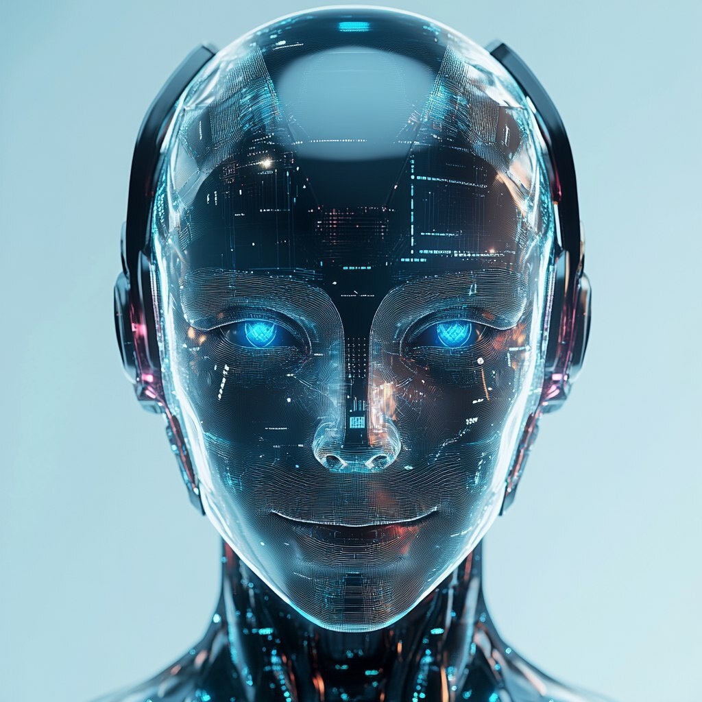 Создано на основе запроса: portrait of a professional cool futuristic creative holographic cybernetic digital AI assistant, blue based colors, id document photo style, look at the camera, wireframe, cyberpunk cyborg, funny, smiling robot