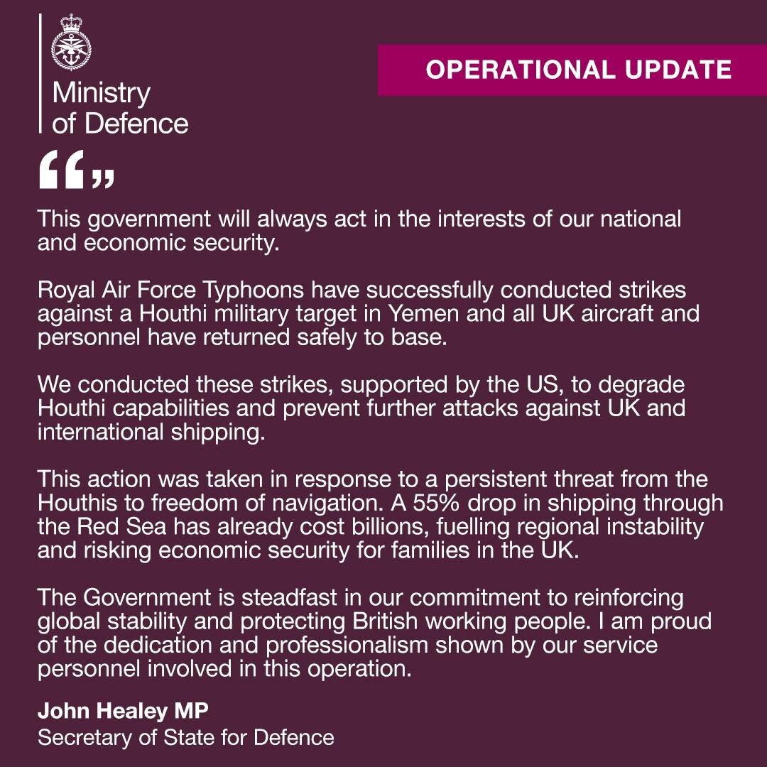 UK MoD statement announces joint strike with US forces against alleged Houthi drone site in Yemen