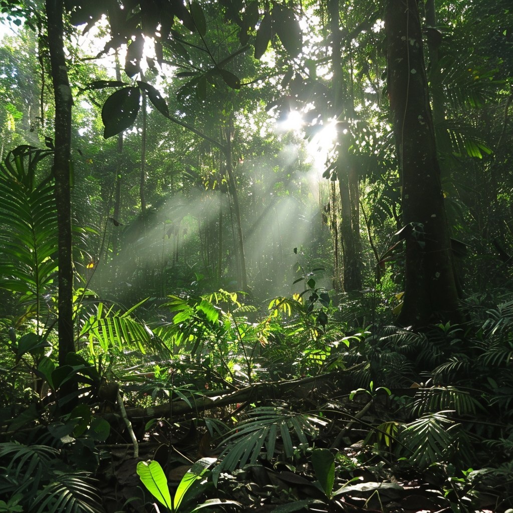 Создано на основе запроса: Deep Forest Clearing - Sunlight rays breaking through thick canopy