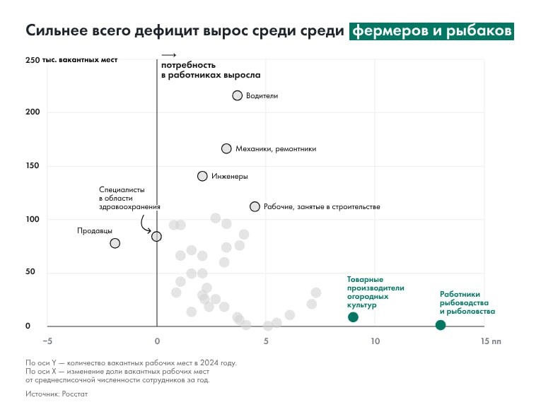 В ответ на пост ⚡️ В 2024 году российским компаниям не хватало 2,2 млн работников — Росстат Это рекорд с 2008 года, для сравнения, в 2022 году не хватало 5,4%, в 2020-м — 3,7%. 👉Сильнее всего дефицит затронул рабочие профессии. 👉Больше всего не хватает водителей (216 тыс.), промышленных рабочих и механиков (166 тыс.), инженеров (141 тыс.) и строителей (112 тыс.). ❗️Каждая вторая дефицитная специальность — из медицины. Наибольшая нехватка врачей скорой помощи (19%), фармацевтов и диетологов (по 15%).