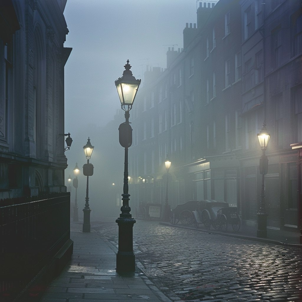 Создано на основе запроса: Victorian London Street - Foggy cobbled streets, gaslights flickering