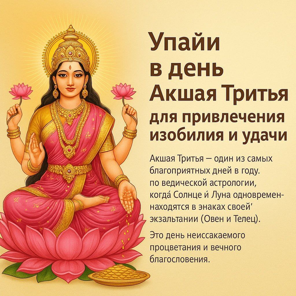 ✨ САМОЕ БЛАГОПРИЯТНОЕ ВРЕМЯ ГОДА НАСТУПИЛО ✨ АКШАЯ ТРИТЬЯ — день неисчерпаемой удачи, процветания и новых начал 🌞🌕 Мои дорогие, в этот особый день, когда и 🌞 Солнце, и 🌕 Луна находятся в своей максимальной силе — открываются ворота удачи, через которые можно пройти с намерением, мудростью и верой. Это день, когда: 🌱 всё, что вы начинаете — растёт 💰 всё, что вы жертвуете — умножается 🔥 всё, что вы очищаете — уходит навсегда 🌸 всё, о чём просите — становится ближе 📿 Я СОЗДАЛА ДЛЯ ВАС ПОДАРОК 🎁 Авторский гайд по упаям (духовным действиям) в день Акшая Тритья, который поможет вам: ✨ активировать энергию богатства ✨ получить благословения предков и высших сил ✨ гармонизировать карму ✨ заложить фундамент на весь год и даже больше 📥 Скачать ГАЙД можно ниже - после этого поста. 📌 В ГАЙДЕ ВЫ НАЙДЁТЕ: - ✔️ Что обязательно сделать в этот день, чтобы привлечь успех, богатство и поддержку Рода - 💎 Лучшие упайи: мантры, действия, пожертвования - 🔱 Ритуалы и рекомендации на день