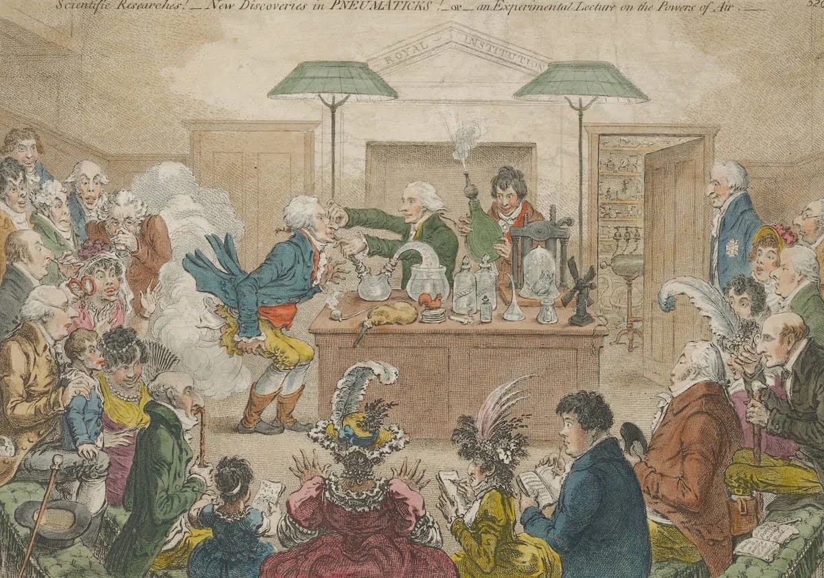 Илл. «Научные исследования! Новые открытия в пневматике, или Экспериментальная лекция о силах воздуха, 23 мая 1802 г.», Джеймс Гилрей. Институт искусств Миннеаполиса. Общественное достояние.