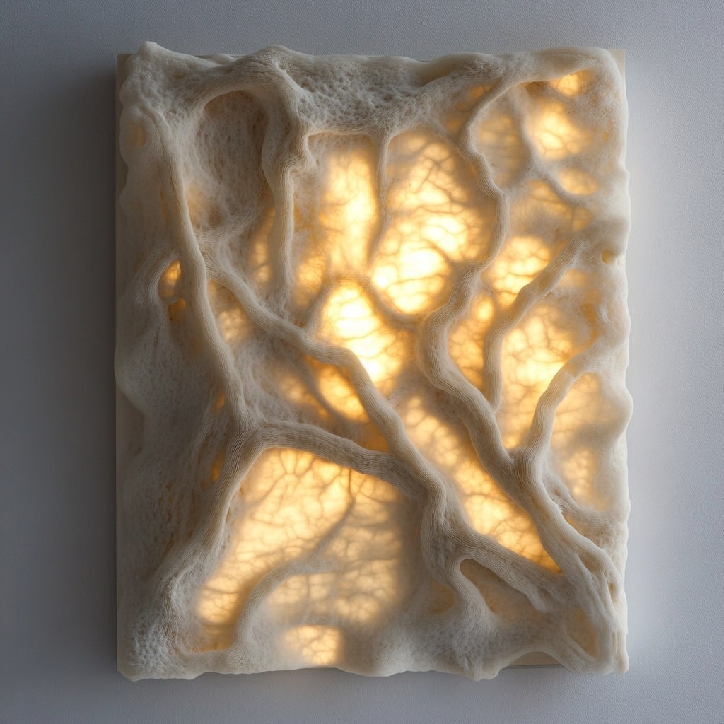 Создано на основе запроса: Interwoven mycelium panels, fibrous and slightly glossy Lighting: Pre-sunrise glow meets faint bioluminescent veins pulsing in panel seams --- Автоперевод: Переплетенные мицелийские панели, волокнистые и слегка глянцевые освещение: сияние предварительного применения встречается с слабыми биолюминесцентными венами, пульсирующими в панельных швах Как тебе такая генерация? 🤔 https://dzen.ru/id/65c0c65c86e4f837c27b24d7 #ИИ #AI #нейросеть #midjourney #art