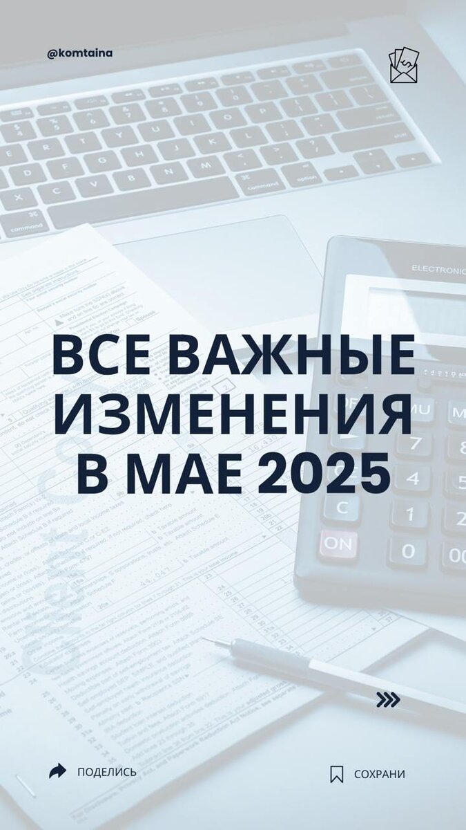 ⭐️ Все важные изменения в мае 2025: как не допустить ошибок и штрафов Май 2025 года — горячий месяц для бизнеса в России. Ошибки в расчетах, отчетности и документах теперь могут стоить бизнесу серьезных денег. Мы собрали в одном гайде все ключевые изменения, чтобы вы ничего не упустили. ✅ Май 2025 года приносит десятки важных изменений для бухгалтеров и бизнеса. ✅ Ошибки в учете персональных данных, отчетности и расчетах теперь будут стоить бизнесу миллионы. ✅ Готовьтесь заранее, обновляйте документы, проверяйте регламенты и учитесь работать по новым стандартам. ⬇️ Сохраните, чтобы в мае не маяться. @komtaina 🔻НДС🔻ЗСК🔻СУР🔻ИНФО🔻