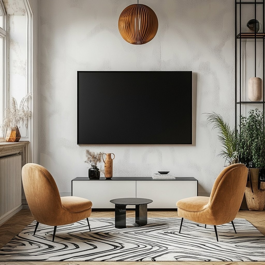 Создано на основе запроса: mockup of a framed TV hanging on a white wall, blank art canvas on screen, neutral african boho modern room, soft