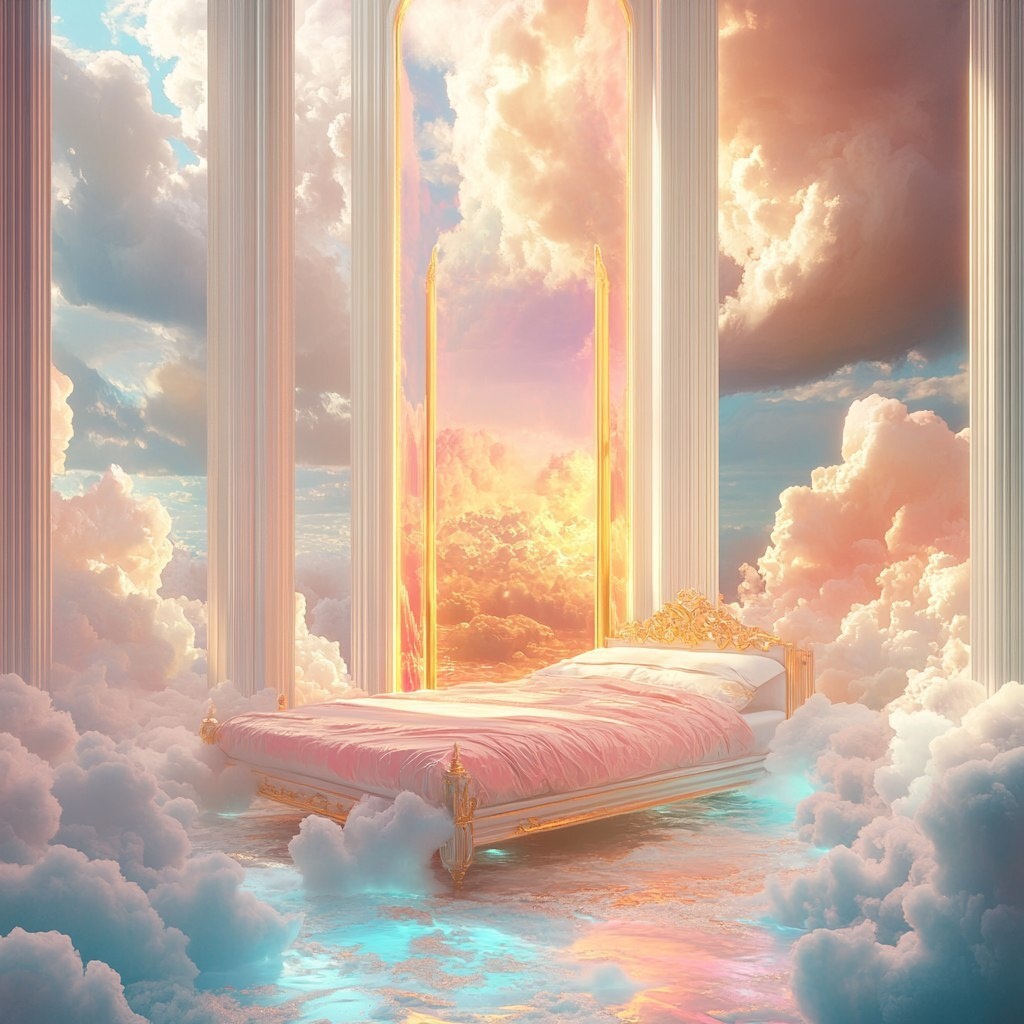 Создано на основе запроса: Create album artwork, futuristic, mystical, colors are white, gold, pink, aquamarine. There is a heavenly bed made out of clouds and a doorway that leads to a mystical other realm that is made of light --- Автоперевод: Создать художественное произведение альбома, футуристическое, мистическое, цвета белые, золотые, розовые, аквамарины. Красиво выглядит? 🤔 https://dzen.ru/id/65c0c65c86e4f837c27b24d7 #ИИ #AI #нейросеть #midjourney #art