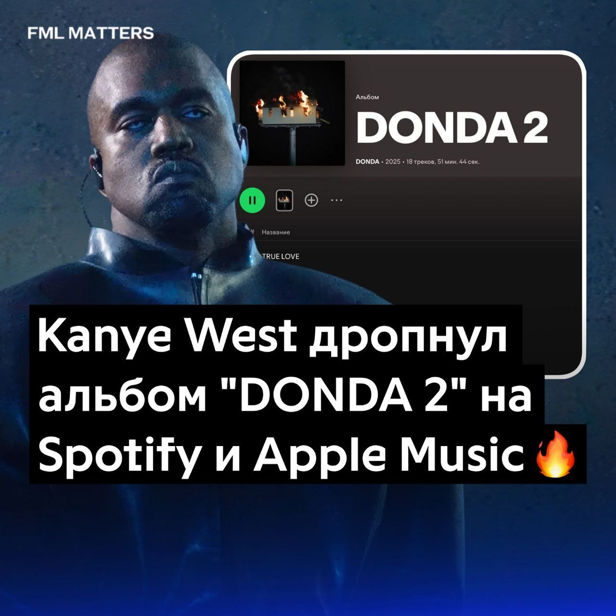 В ответ на пост ❗️ «DONDA 2» — НА СТРИМИНГОВЫХ ПЛОЩАДКАХ! Йе дропнул пластинку на все популярные стриминговые сервисы. Релиз, состоящий из 18 треков, был эксклюзивно доступен на платном проигрывателе Stem Player за $200. ➖ TRUE LOVE ➖ BROKEN ROAD ➖ GET LOST ➖ KEEP THE FLOWERS ➖ TOO EASY ➖ PABLO ➖ MR MIAGI ➖ HAPPY ➖ SECURITY ➖ CITY OF GOD ➖ 530 ➖ SCIFI ➖ BURN EVERYTHING ➖ LOUIE BAG ➖ WE DID IT ➖ MAINTENANCE ➖ LORD LIFT ➖ FIRST TIME Послушать можно в нашем втором канале FML MUSIC 💀 FML MATTERS