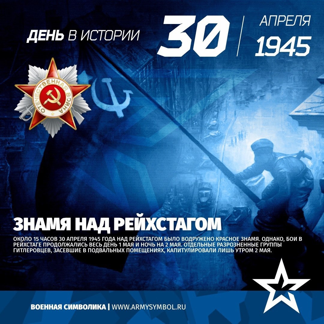 Знамя над Рейхстагом Около 15 часов 30 апреля 1945 года над рейхстагом было водружено Красное знамя. Однако, бои в рейхстаге продолжались весь день 1 мая и ночь на 2 мая. Отдельные разрозненные группы гитлеровцев, засевшие в подвальных помещениях, капитулировали лишь утром 2 мая. #ПамятныеДатыВоеннойИсторииОтечества #ДеньВИстории #ГодЗащитникаОтечества #80ЛетВеликойПобеды Источник: https://vk.com/wall-60767131_30517 Подпишитесь на наши группы ВКонтакте и в Одноклассниках - читайте, смотрите и комментируйте! Источник