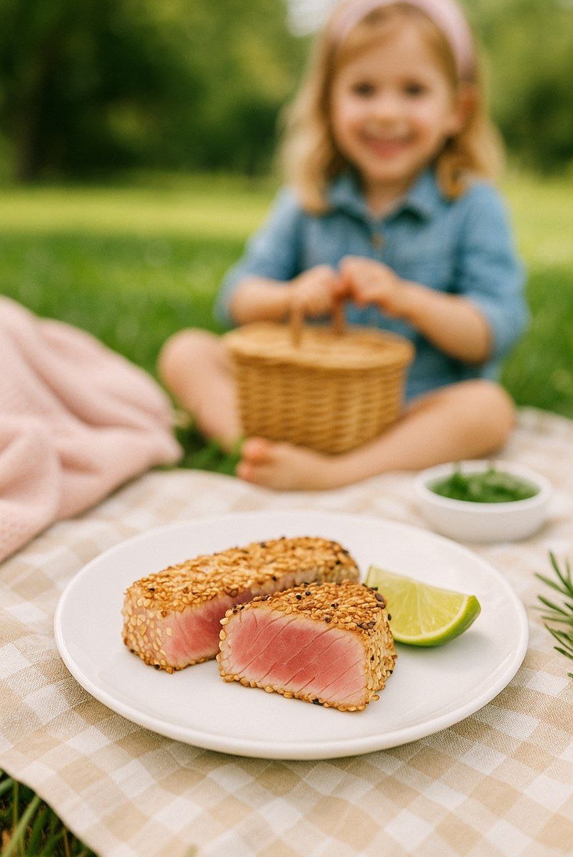 Тунец в кунжутной корочке Тунец в кунжутной корочке — это изысканный шашлык с насыщенным вкусом, богатый белком и полезными жирами. Хрустящая корочка из кунжута придаёт особую текстуру, а лайм освежает и подчеркивает вкус рыбы. Ингредиенты: Филе свежего тунца — 400 г Белый и чёрный кунжут — 4 ст. л. Соевый соус — 2 ст. л. Оливковое масло — 1 ст. л. Лайм — 1 шт. Соль, перец по вкусу Приготовление: 1. Нарежьте тунца крупными кубиками или полосками. 2. Замаринуйте рыбу в смеси соевого соуса, масла, сока лайма и специй на 15 минут. 3. Обваляйте каждый кусочек в смеси кунжута. 4. Обжарьте на гриле или сковороде по 1–2 минуты с каждой стороны — внутри рыба должна остаться слегка сыроватой. 5. Подавайте с дольками лайма и зеленью. Фишка: можно собрать шашлычки на шпажках для пикника, а подавать — на лепёшке или листе салата.